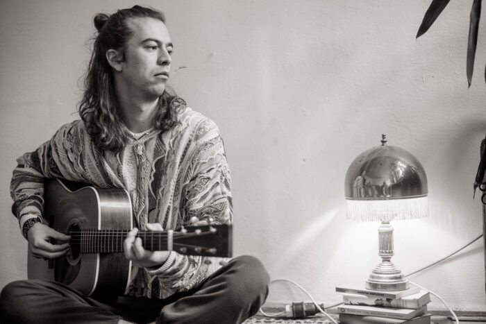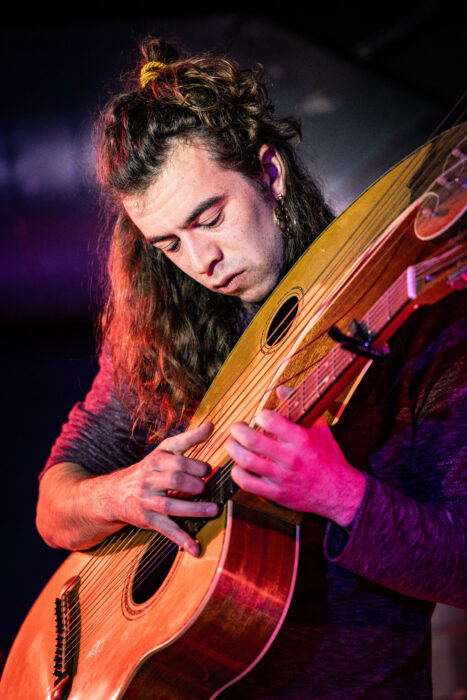His self-composed music is characterized by emotional and textured sounds that emerge from the uncharted depths of his acoustic string instruments.