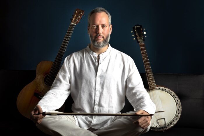 In his solo albums, as well as in live performances, he uses acoustic guitar, bowed banjo, and voice.