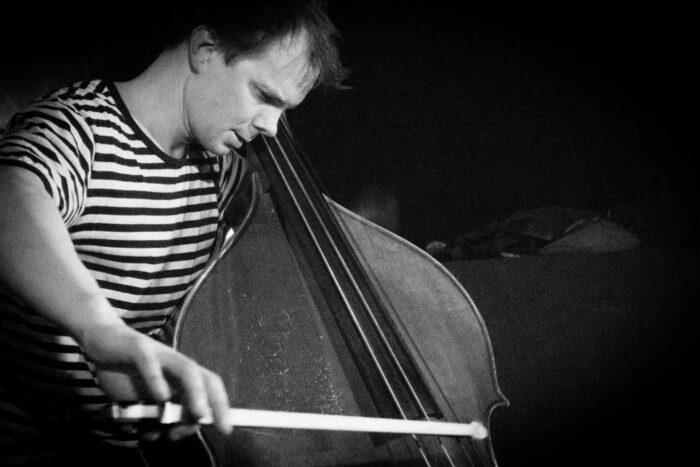Bleeps and bloops trickle the repetitive rhythms and drones from the acoustic bass.