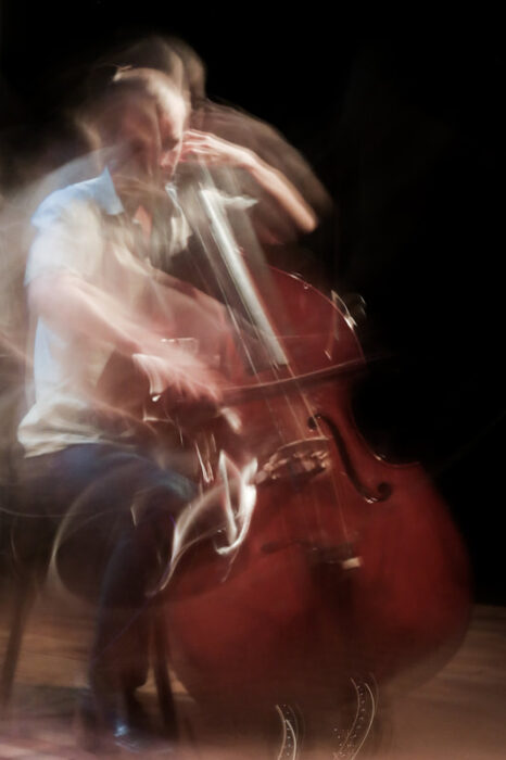 The sound is the interaction of non-reactive, live-sample manipulation from the electronics, and improvisational conversations with the bass through subtly varying qualities of the simple sounds of the bass.