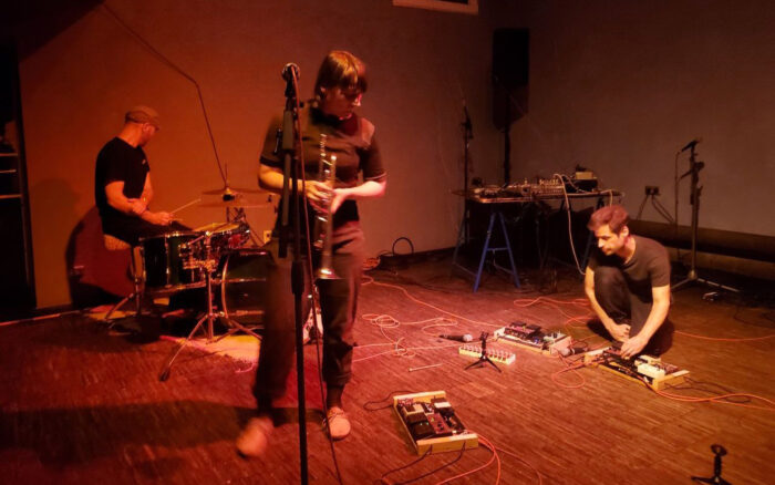 They layer voice, resonance, repetition, movement, and memory — combining iterated fragments of voice, percussion, trumpet, and bass.